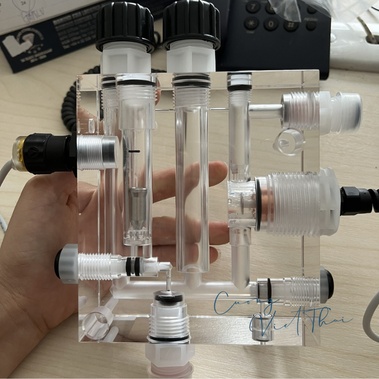 Thiết bị đo điện hóa dòng chảy hở bao gồm một giá đỡ điện cực dòng chảy với điện cực phát hiện clo và một cảm biến lưu lượng.